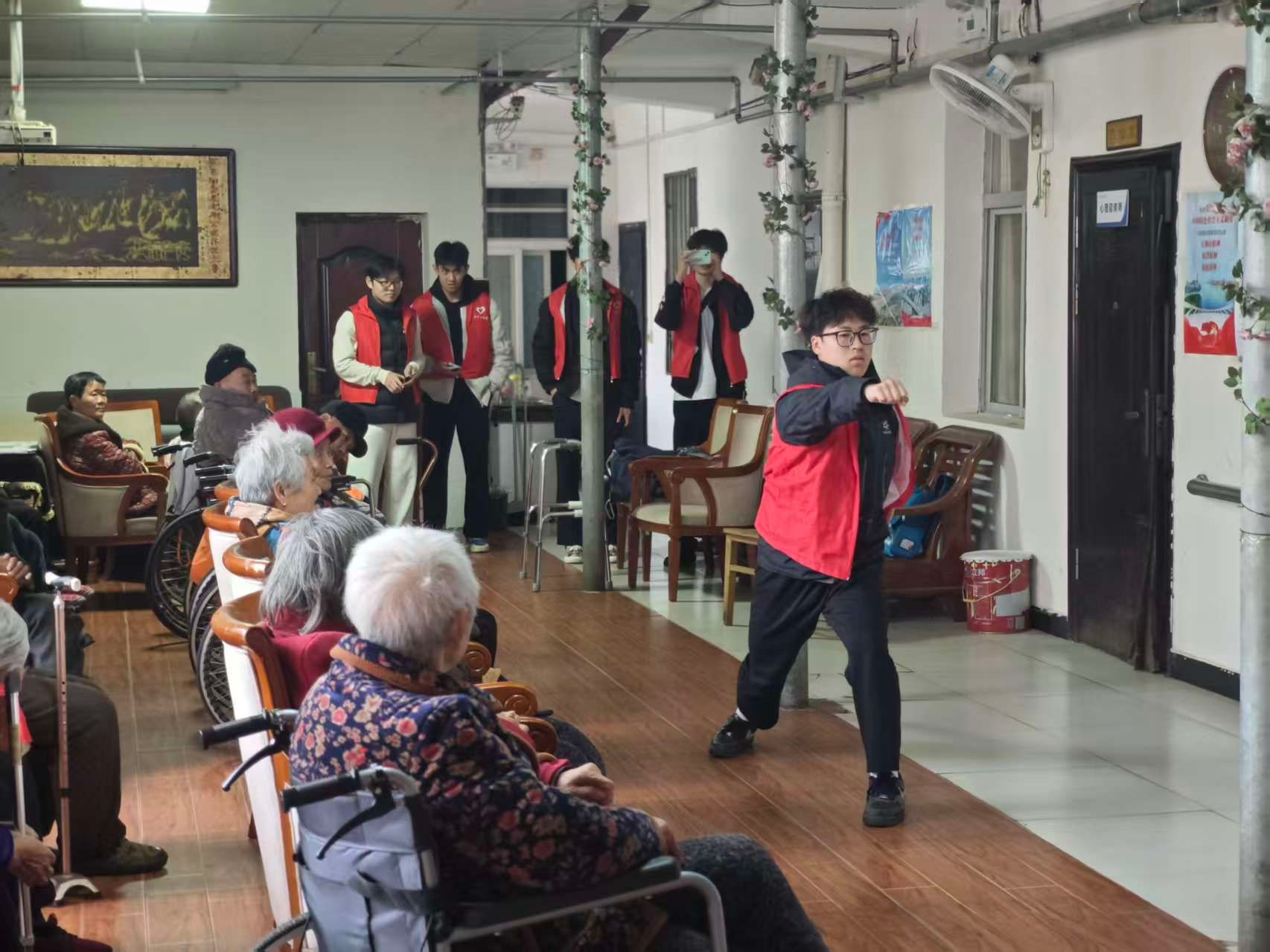 随后,氛围在文艺互动中迅速升温。志愿者们唱起经典老歌,熟悉的旋律引来不少老人轻声跟唱。考虑到老人的身体状况,学生们还专门设计了一套“乐活健康拍打操”,带领老人们随着节奏拍打穴位、活动关节。在轻快的节拍和耐心的示范下,老人们兴致勃勃地参与其中,活动室里洋溢着温馨与活力。