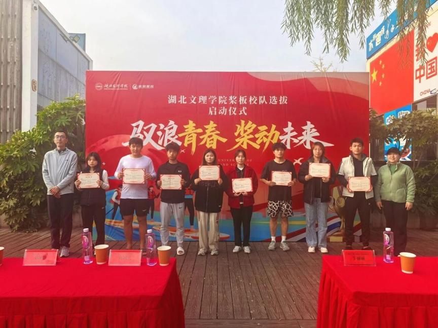 颁奖仪式上,牛丽丽与社会体育指导系主任姜宇为入选者颁发证书,并寄语道:“桨板不仅是运动,更是与汉江对话的方式。希望你们以水为师、以桨为笔、以勤为径、以合为贵,书写属于湖文大学生的竞技传奇!”入选学生陈翔激动表示:“从校园走向赛场,我们肩负着推广水上运动的使命,定会全力以赴备战省运!”